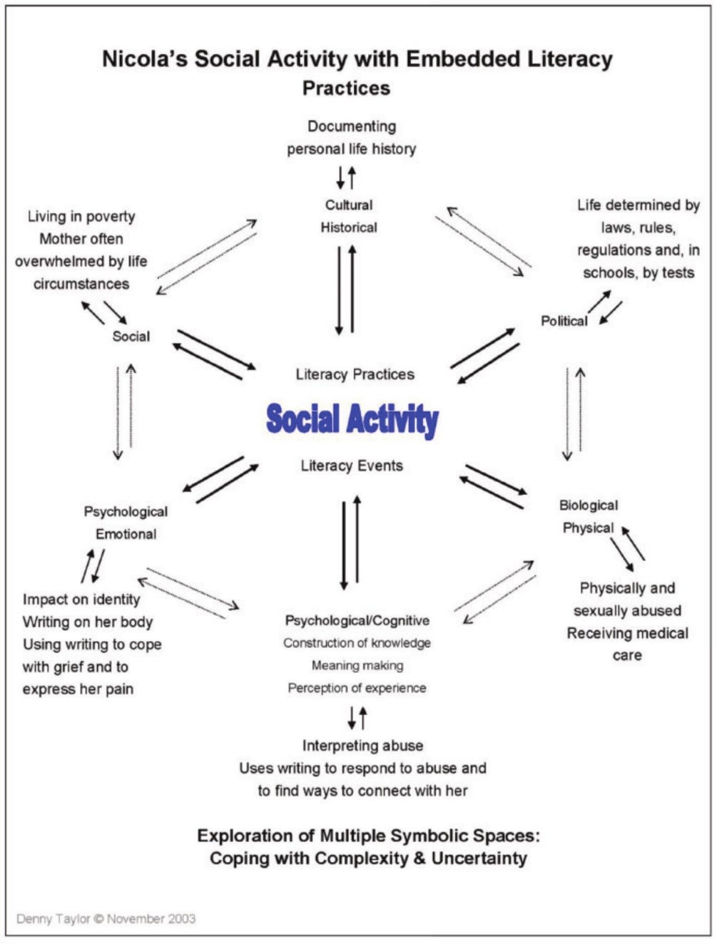 The following graphic of Nicola’s social activity and embedded literacy practices provides an example of the complexity of the lived experience of a traumatized child. The graphic also underscores that children’s early reading and writing productions cannot be reduced to direct instruction in “reading skills” that discount the lived complexity of reading and writing in children’s everyday lives.